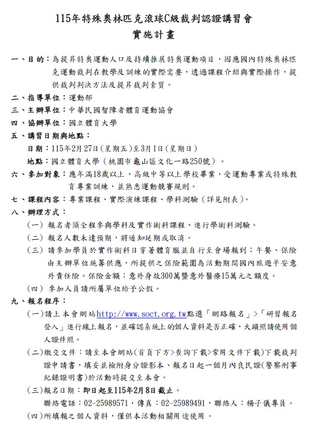 -此場講習會實施計畫、課程表等相關資料,將以運動部最終核准版本為準。 -詳情請參閱附件,研習報名系統連結:https://reurl.cc/p6Wvvd