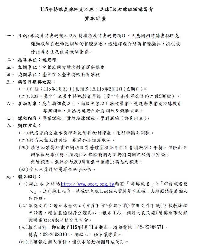 -此場講習會實施計畫、課程表等相關資料,將以運動部最終核准版本為準。 -詳情請參閱附件,研習報名系統連結:https://reurl.cc/p6Wvvd -羽球、足球只能擇一報名,報名前請確認選擇項目是否為欲報名的項目。